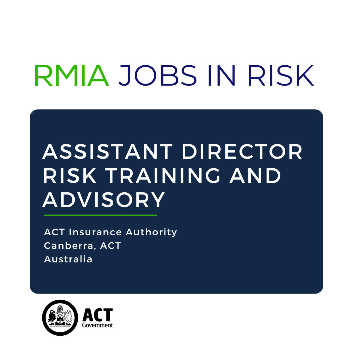 The ACT Insurance Authority (ACTIA) is looking for an enthusiastic, positive and motivated individual, who has a passion for improving risk management capability through training design and delivery, to join us as an Assistant Director, Risk Training and Advisory, on a permanent basis.